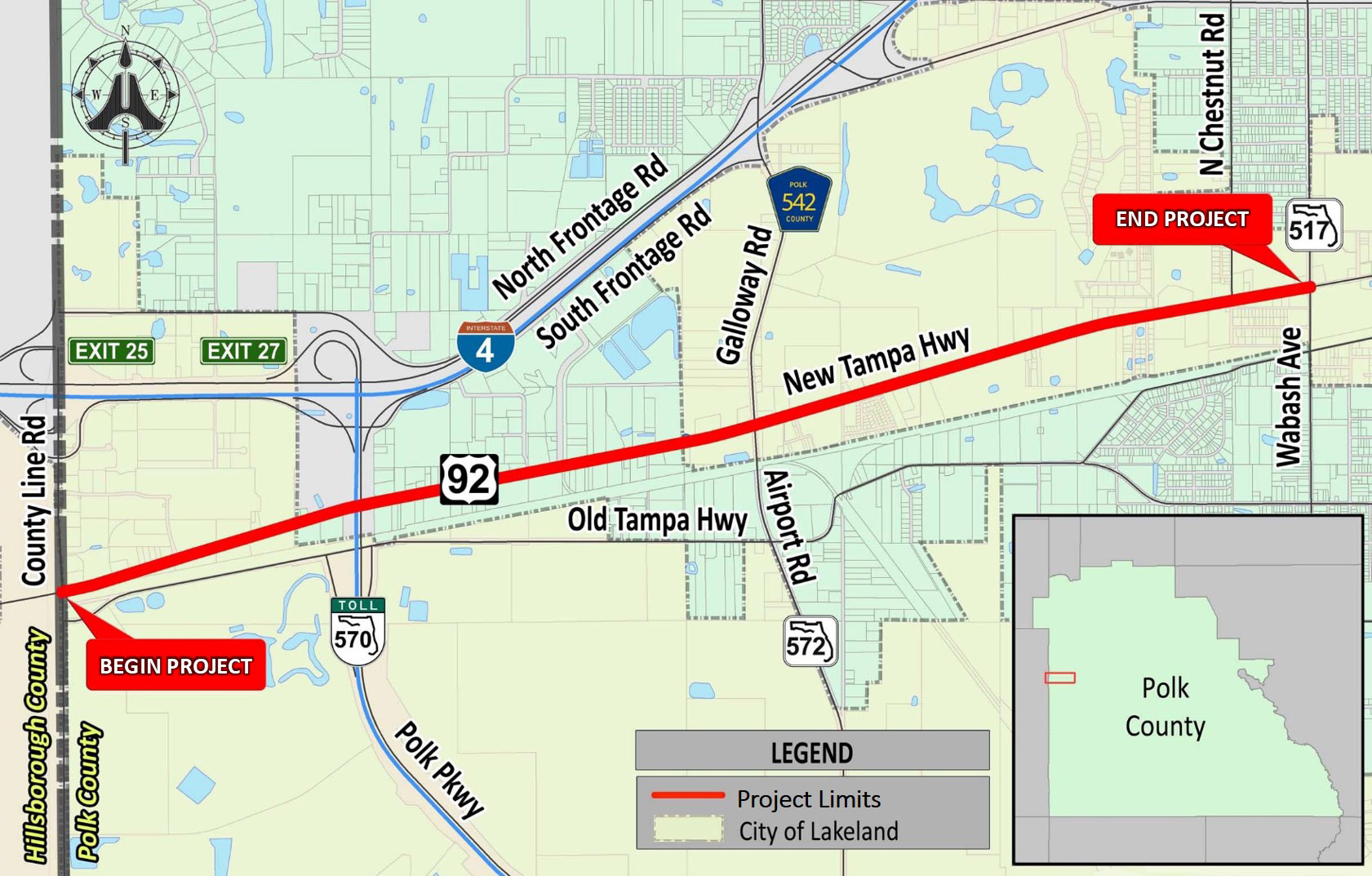 The Florida Department of Transportation (FDOT) District One began a Project Development and Environment (PD&E) study in January 2014 to evaluate alternatives to widen US 92 (New Tampa Highway) from two to four lanes between County Line Road and Wabash Avenue in Polk County. The PD&E phase of this project ended on November 27, 2017 when the Florida Department of Transportation Office of Environmental Management (OEM) granted Location and Design Concept Acceptance (LDCA).  This project has moved into the design phase of project development.  The roadway design is scheduled to be completed in the spring of 2026, and will include pedestrian and bicycle improvements.